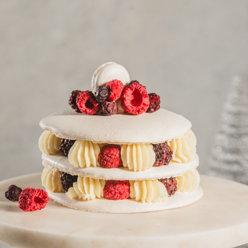 Capas delicadas de macaron, relleno cremoso de queso y un corazón de frutos rojos que enamora. Una torta pequeña, elegante y llena de sabor, perfecta para celebrar en versión mini.