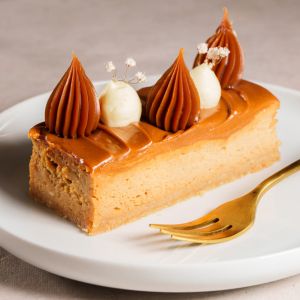 - Para el relleno, batir el queso crema hasta alisar, incorporar el azúcar, huevos de a uno, el dulce de leche, crema agria, extracto de vainilla y sal. Finalmente integrar la crema de leche hasta tener una preparación homogénea. Volcar sobre la base reservada y hornear a 160°C por 35 minutos.