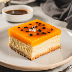- Para el armado, cubrir el cheesecake con el gel de maracuyá y refrigerar al menos 8 horas. Luego desmoldar, cortar en barras y decorar a gusto.