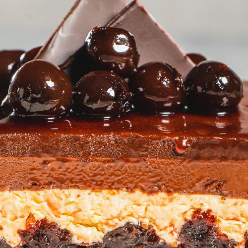 - Para el armado, colocar primero la mousse de chocolate blanco sobre la marquise y refrigerar hasta que solidifique. Agregar encima la mousse de chocolate semiamargo y volver a refrigerar hasta que tome cuerpo. Finalizar con una ganache de chocolate y decorar con más amarenas por encima.