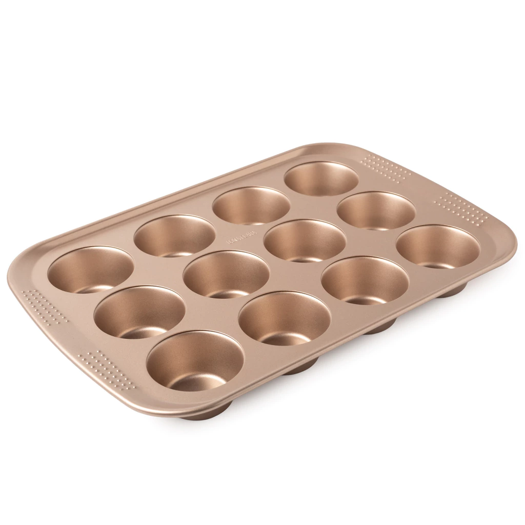 Molde de acero al carbono para cupcakes o muffins. MATERIAL: ACERO ; ANTIADHERENTE: SÍ ; GARANTIA: SEGUN ESPECIFICACIONES DE LA MARCA ; LARGO: TOTAL: 41 CM ; ANCHO: TOTAL: 28 CM ; PESO: 910 G ; ALTO: TOTAL: 5,5 CM ; ALTO: CAVIDAD: 4,5 CM ; CAPACIDAD: 12 CAVIDADES ; DIÁMETRO: CAVIDAD SUPERIOR: 8,2 CM ; DIÁMETRO: BASE: 6 CM